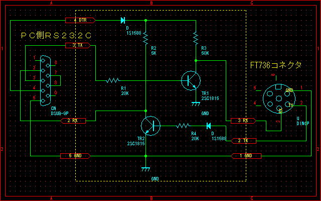 パソコンとの接続のためTTLレベルへの変換をトランジスタ2個を使って製作した。