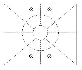 中心から十字にマジックなどで直線を引きます。その半分の角度(45度)で2本の直線を引き