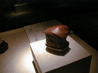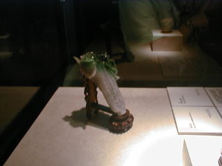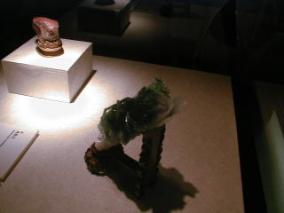 非常に有名な ヒスイの白菜(皇帝を表す)。白菜にはキリギリスが2匹表現されており、皇帝に仕える悪い官僚を表しているという現地ガイドの説明があった。直接皇帝に進言できないため、このような作品が作成された1品 とのこと。公式解説は少し違っているが。